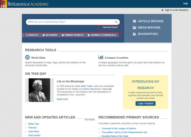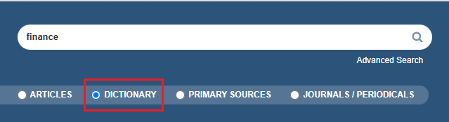 在简单检索框输入检索词,无需区分大小写,按Enter键即可执行检索。可根据检索需求选择不同资源类别:文章(ARTICLES)、韦氏大词典(DICTIONARY)、原始文献(PRIMARY SOURCES)、期刊杂志(JOURNALS/PERIODICALS)。高级检索(Advanced Search)可以增加限制条件来优化检索。