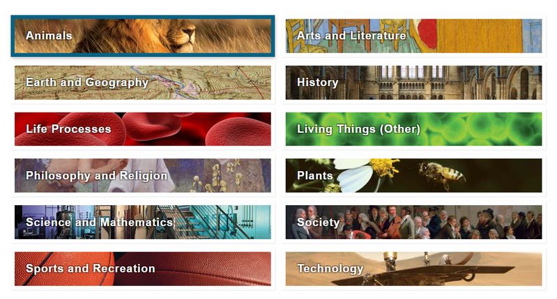 可按动物、历史、植物、社会、科技、艺术与文学等12个大主题及各自分主题浏览文章及媒体资源。