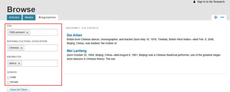 可按年代、国籍、专业领域、性别等筛选历史和现代人物传记。