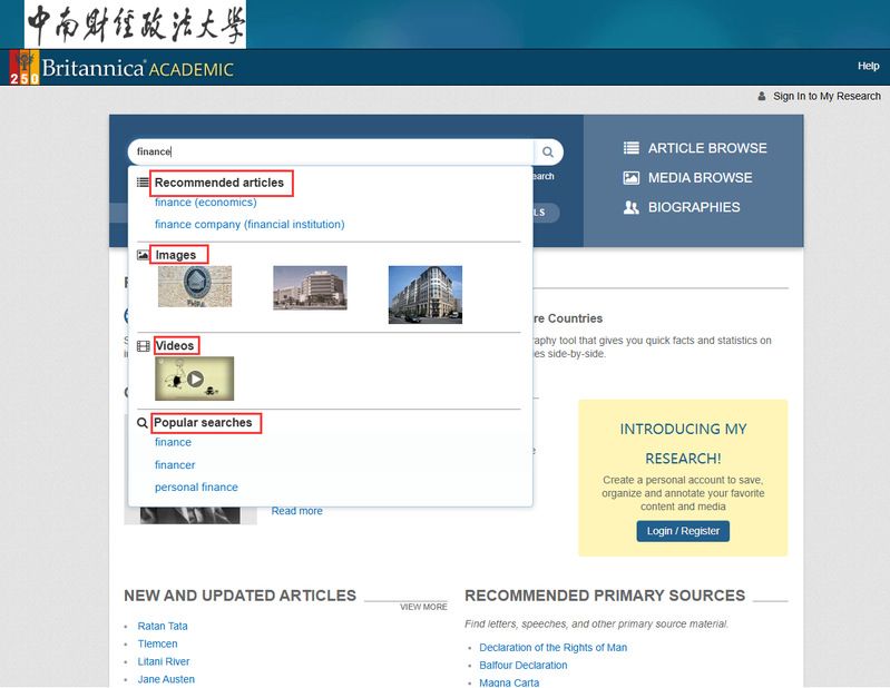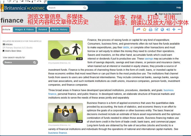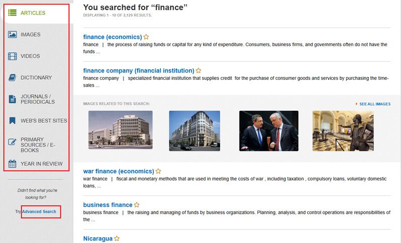 读者也可以在执行检索以后,通过左侧菜单内的图标,按类型筛选检索结果,例如⽂章(ARTICLES)、图像(IMAGES)、视频(VIDEOS)、词典(DICTIONARY)、期刊杂志(JOURNALS/PERIODICALS)、原始⽂献与电⼦书(PRIMARY SOURCES/E-BOOKS)或年鉴(YEAR IN REVIEW)。