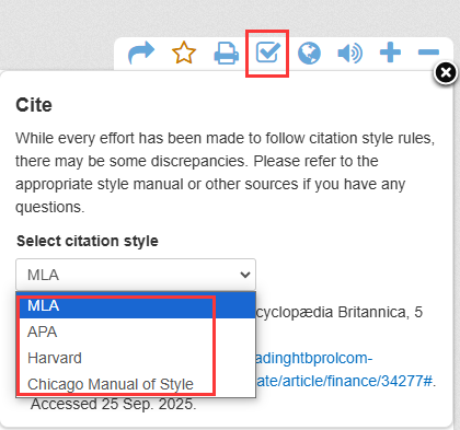 引用:可根据需要从MLA、APA、Harvard、Chicago Manual of Style四种格式中选择一种,创建自动引用格式。