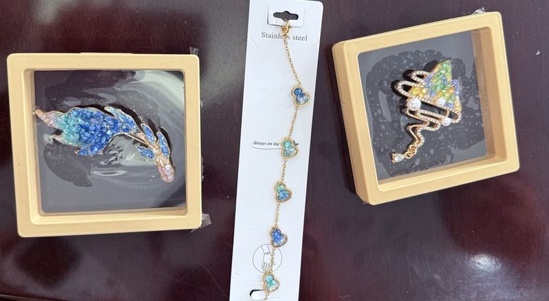 在手工制作环节,女职工们被分为“胸针组”与“手链组”,领取了包含天然螺钿片、金属底托、胶水等工具的材料包。“螺钿片要顺着纹理裁剪,才能呈现最佳珠光效果。”老师手把手指导大家处理螺贝薄片,从设计图案、粘贴定位到固定成型,每一步都凝聚着耐心与巧思。现场气氛温馨而专注,女职工们时而低头细剪螺钿,时而轻声交流设计灵感。近1小时的创作中,原本冰冷的金属托与斑斓的螺贝逐渐融合,变成一枚枚独一无二的艺术品。活动尾声,女职工们佩戴着亲手制作的螺钿饰品合影留念,珠光流转的作品与笑靥相映成趣。分工会还为每人准备了非遗伴手礼,螺钿耳钉、手串等小巧精致的物件,让文化体验从“指尖”延伸到“日常”。
