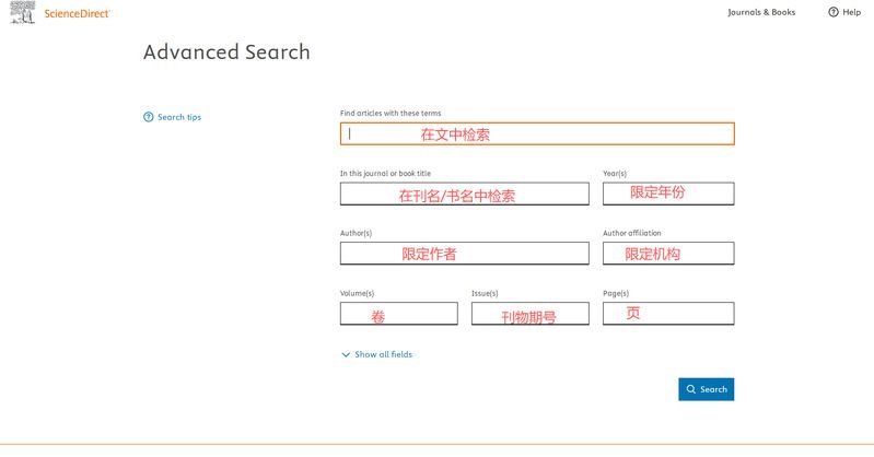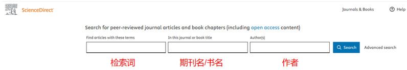 在ScienceDirect首页上方,读者可以通过检索词、期刊或图书名称、作者信息进行简单检索。