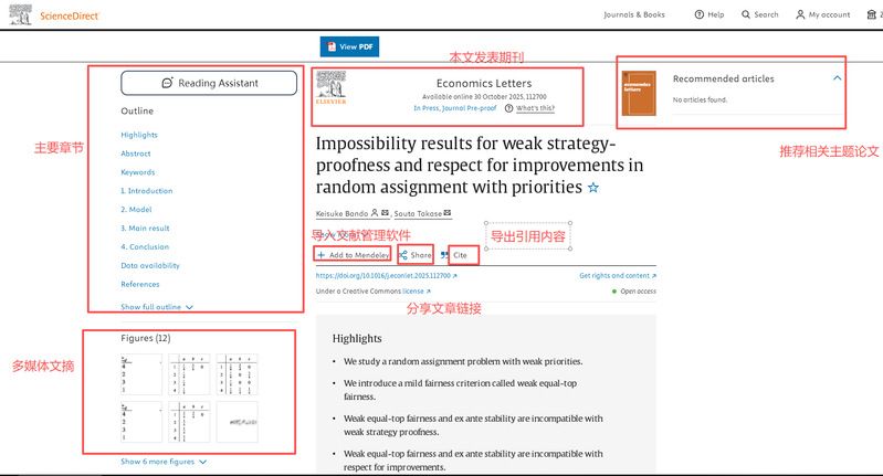例如在检索框中输入检索词“economics”,会显示检索结果列表,提供下载PDF、导出引用格式、提示访问权限等基本信息。