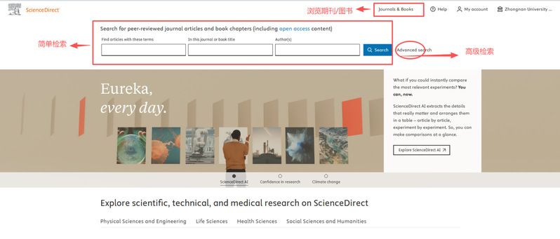 ScienceDirect数据库平台首页提供基本检索的检索框入口,读者可以直接进行简单检索、高级检索,也可以对图书/期刊进行浏览。
