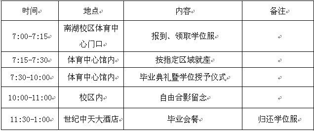 5.中午毕业聚餐定于南湖校区北门世纪中天大酒店,校内步行可达,届时归还学位服;