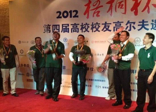 虽然天公不作美,但恶劣的天气丝毫没有影响参赛队员的斗志,大家依然兴致勃勃挥杆竞技,演绎风采。经过激烈角逐,代表我校校友高尔夫球队的朱晋桥、熊泽振、梁成峰、胡亮、汤启中、杨爱斌、贺国强以229杆的成绩荣获团体冠军,米兰电竞·(中国区)校友高尔夫球队以230杆获团体亚军、西安交大校友高尔夫球队以230获团体季军。我校梁成峰、熊泽振以70杆获得最佳拍档。该赛事仅有的两项大奖均被我校尽收囊中!