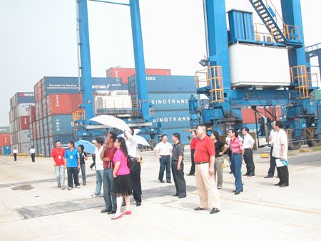 最后,学员们考察了位处武汉阳逻经济开发区的阳逻港(国家一类开放口岸)的国际集装箱转运港口。该港口由长江中上游首家外商控股的中外合资港口企业经营,常年可停泊5000吨级船舶和宽身浅底的万吨级船舶,是长江中上游第一个按国际标准设计的专业化集装箱码头,也是武汉水运口岸第一家正式开展进出口跨关区货物中转业务的码头公司。码头配有大跨距集装箱岸边起重机、多用途门机和轮胎式龙门起重机等一系列先进的集装箱装卸设备,以及CTMS系统、CCTV系统等现代化的计算机信息管理系统。