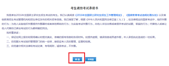 点击报考完毕后出现报考2016年硕士研究生考生诚信考试承诺书,待“同意”选项弹出后,点击同意;