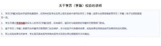 3、报名期间将对考生学历(学籍)信息进行网上校验,并在考生提交报名信息三天内反馈校验结果。考生可随时上网查看学历(学籍)校验结果。考生也可在报名期间自行登录中国高等教育学生信息网查询本人学历(学籍)信息。未通过学历(学籍)校验的考生应及时到湖北省高校毕业生就业指导服务中心进行认证,在现场确认时将认证报告交报考点核验。