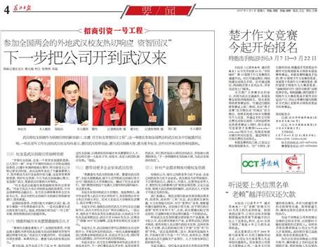 2017年3月4 日,长江日报刊登了全国政协委员、民建中央调研部部长、我校知名校友蔡玲教授,关于武汉市实施“资智回汉”工程的评论:“应把武汉的招商引资和城市发展与长江经济带和‘一带一路’两大国家战略深度融合起来”。蔡玲说:“开展校友招商,这是一个非常有创意的思路,让人耳目一新。武汉这些年走出了大量高素质人才,很多都成为各行各业的中坚力量,这是非常难得的资源,用好校友资源,不仅为武汉招商凝心聚力,也是推广武汉、更新武汉印象的大好契机。”