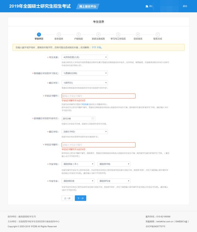 请考生提前准备网报相关信息,以免在网报时由于单个页面停滞时间过长而导致报名失效。