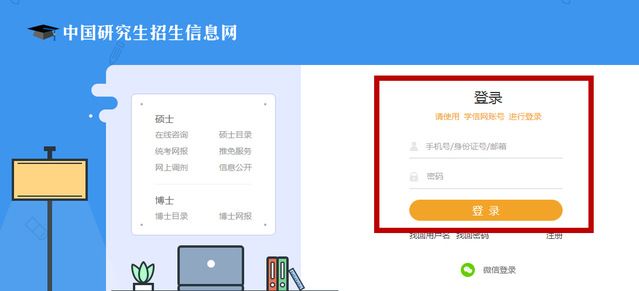 1、考生登录《中国研究生招生信息网》(网址: http://yz.chsi.com.cn)输入账号”“密码(登录前须先进行注册)