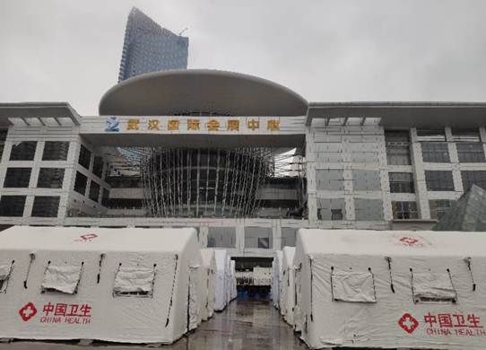 同时救援队在武汉国际会展中心“方舱医院”外的广场就地展开,撑起帐篷,搭建临时病房及医院,以备收治更多的患者。