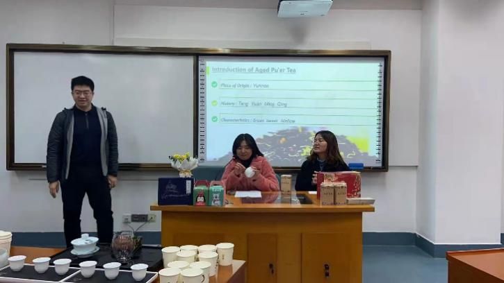 有的组员现场演奏吉他,为“销售现场”助兴,为班级助兴。有的小组请来了巴基斯坦国际友人来助阵,并与大家进行亲切的交谈。还有的小组甚至将斟茶用的全套茶具与精美茶品带来了现场,当场斟茶,与同学们分享。