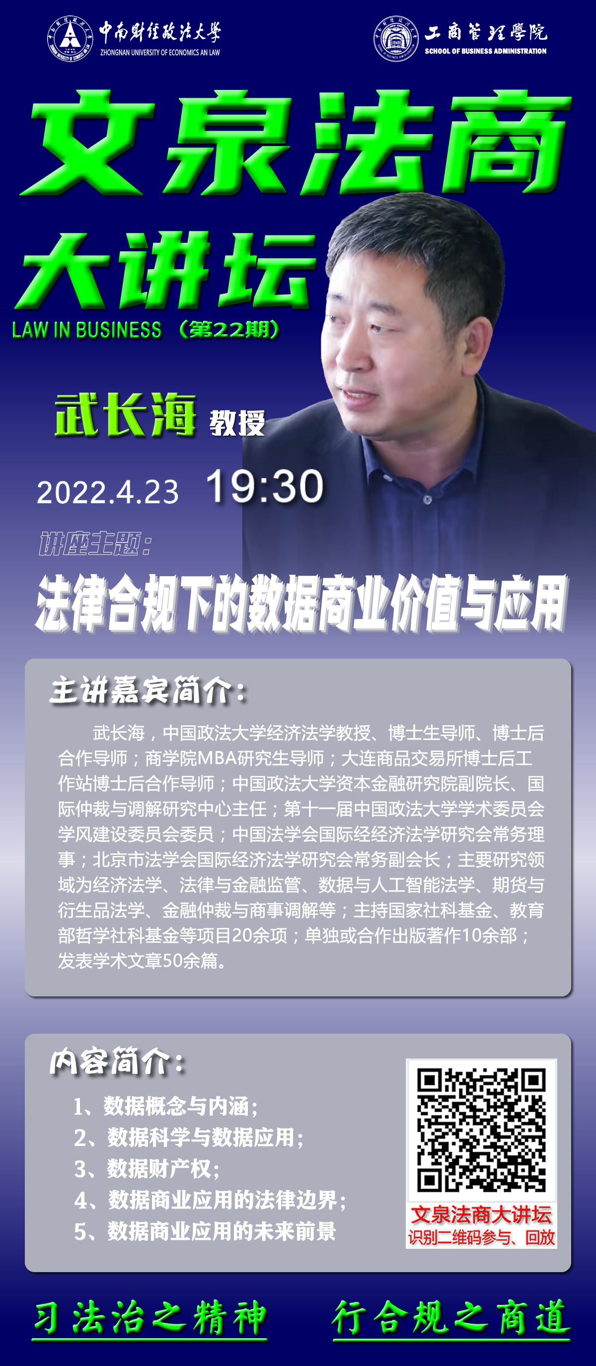 | 第22期 | 4.23(周六) 19:30 | 武长海教授 | 中国政法大学资本金融研究院 | 法律合规下的数据商业价值与应用 |