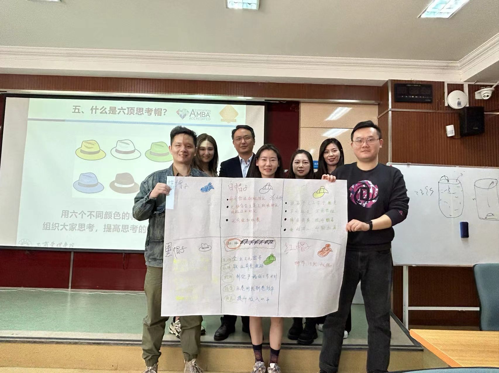 在进行了具体案例的商业模式画布分析后,宋老师让同学们思考自己的商业模式画布:自身存在哪些优势和核心资源,能够做出哪些产出,具体产出对象,关键流程以及成本收益组成项。为了实现商业模式画布的资源最大化,在团队沟通环节,宋老师引出“六顶思考帽”思考法,让同学们通过具体案例讨论和分享,在沟通过程中统一方向,并针对案例存在的问题提出可行性解决方案,使大家深受启发。