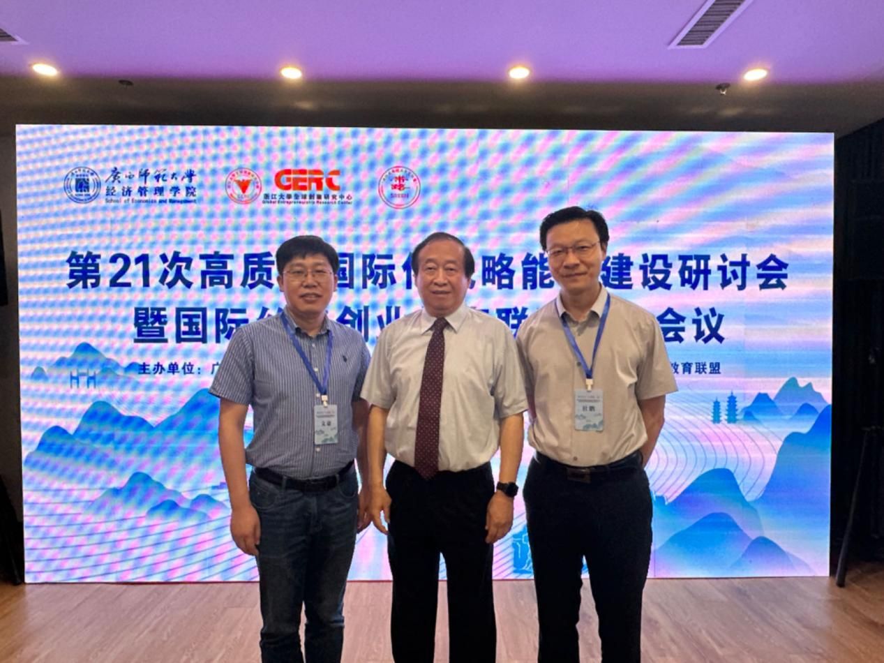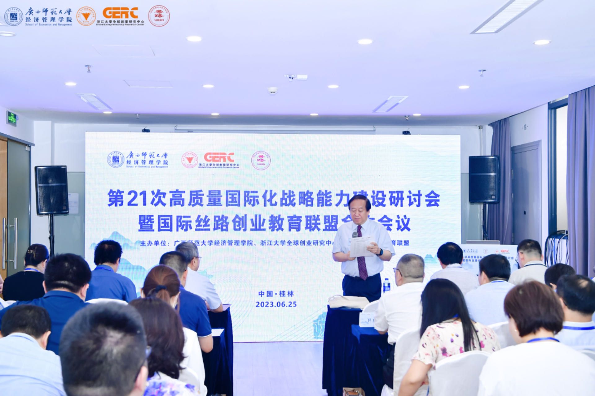 2023年6月25日,由广西师范大学经济管理学院、浙江大学全球创业研究中心、国际丝路创业教育联盟联合主办的第21次高质量国际化战略能力建设研讨会暨国际丝路创业教育联盟合作会议于广西师范大学经济管理学院顺利召开。AMBA&BGA国际顾问委员会委员兼中国区总顾问、浙江大学文科资深教授、浙江大学全球创业研究中心主任王重鸣教授主持会议并做报告。会议吸引了来自全国36所经管院校的70余名代表,工商管理学院副院长兼MBA教育中心副主任文豪教授、MBA中心学术主任杜鹏教授受邀参加了此次研讨会。