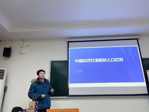 接下来汇报组的选题为:中国如何打造新的人口红利,汇报代表:康书,康同学所在组结合中国人口红利现状提出了三点解决措施,用诙谐幽默的演讲风格和通俗易懂的事例引起了同学和老师的激烈讨论,互动环节热闹非凡。