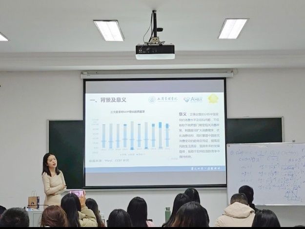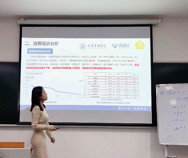 首先上台汇报组的选题为:中国的消费水平和结构问题,汇报代表胡适,演讲环节胡同学逻辑严谨,思路清晰,层层递进,堪称专业级的演讲水平,连老师也忍不住直呼入选高分组!