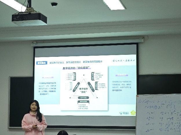 第四组,选题为:数字经济和实体经济融合发展的可能路径,汇报代表:万子靖,万同学结合生活案例,生动鲜活的给我们讲解了何为数字四化经济,数字经济如何与实体经济融合发展并发挥巨大的作用。