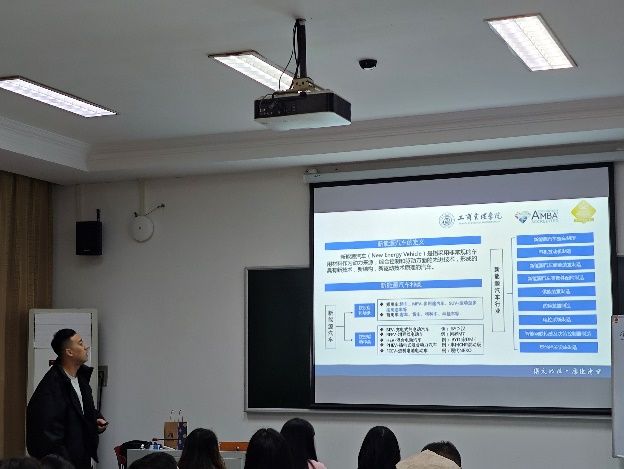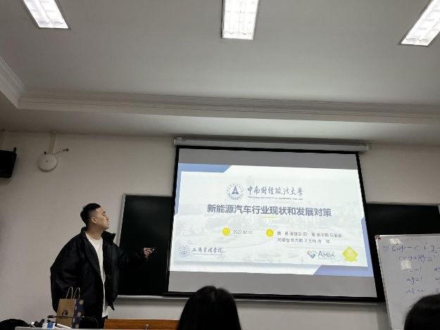 第五组,选题为:新能源汽车行业现状和发展对策,汇报代表:蒋楚云,蒋同学从汽车行业的点、线、面进行了全面的分析,结合当前国内发展局面,讲述了新能源汽车的发展对策。