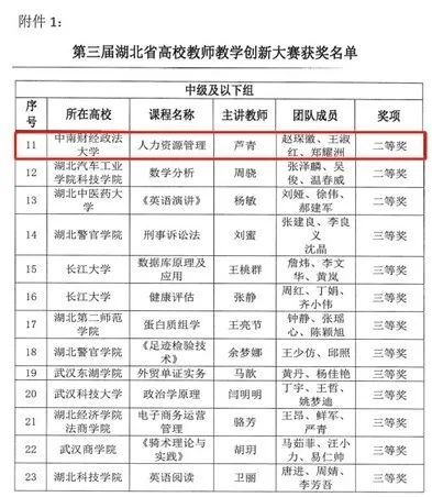 此外,在第三届湖北省高校教师教学创新大赛上,我院任课教师芦青主讲的《人力资源管理》课程荣获中级及以下组二等奖。
