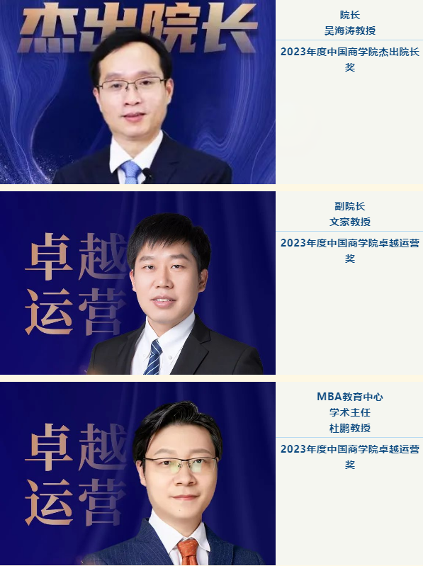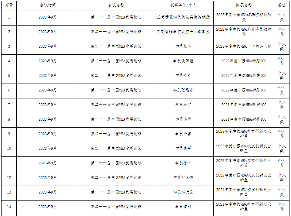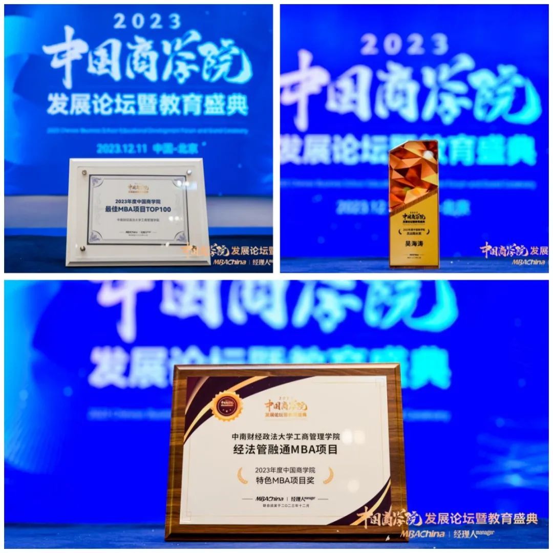 2023年9月,在第二十一届中国MBA发展论坛上,院长吴海涛教授、副院长文豪教授荣获“2023年度中国MBA培养院校领航奖”,12名MBA校友分别荣获“2023年度中国MBA新秀100”及“2023年度中国MBA校友创新创业新星”奖。