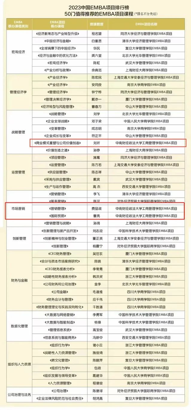 项目始终坚持立德树人,不断优化课程设计和师资队伍,在2023中国EMBA排行榜50门值得推荐的EMBA项目课程中,我院费显政教授的《营销管理》、曹亮教授《国际贸易》、刘圻教授《商业模式重塑与公司价值创造》成功入选。
