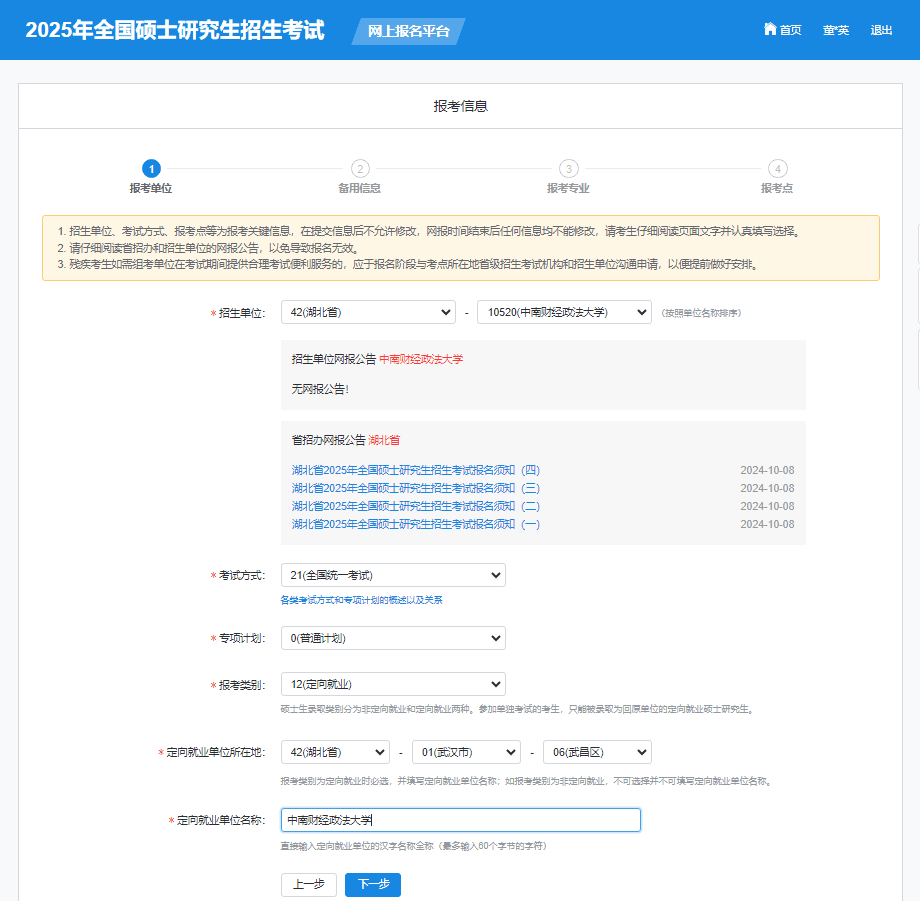 注意:填报信息前请认真阅读报名页面的提示信息,带*的文本框为必填内容。请考生根据本人资料认真填报,在“考试方式”一栏务必选择“全国统一考试”,专项计划选择0(普通计划),“报考类别”一栏请选择“定向就业”。