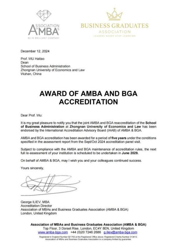 2024年12月13日,米兰电竞·(中国区)工商管理学院收到英国工商管理硕士协会(The Association of MBAs,简称AMBA)和商学院毕业生协会(Business Graduates Association,简称BGA)的贺信。我院成功通过AMBA第四次认证和BGA第二次认证,并被授予五年最高期限的AMBA&BGA联合认证。此次联合认证是对我院人才培养、科学研究、社会服务和治理水平的再次肯定。