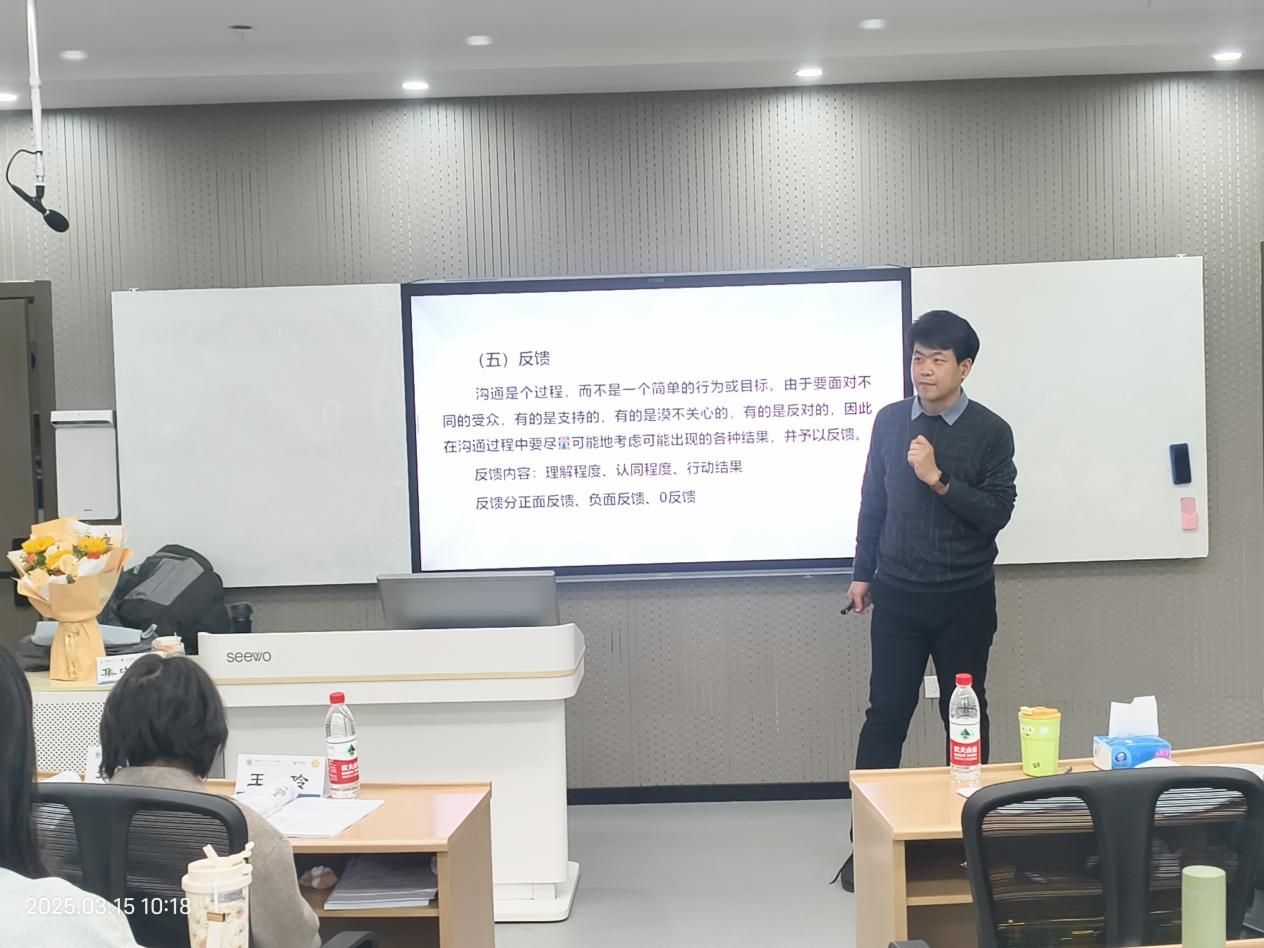 本次课程由工商管理学院副教授张传杰老师主讲,内容涵盖了管理沟通理论、沟通的一般过程、沟通的障碍因素、沟通能力的提升这四大板块。通过案例分析、小组讨论、情景模拟、角色扮演等多元化教学形式,学员们不仅系统掌握了沟通的底层逻辑,更在实践中锤炼了应对复杂管理场景的沟通能力。