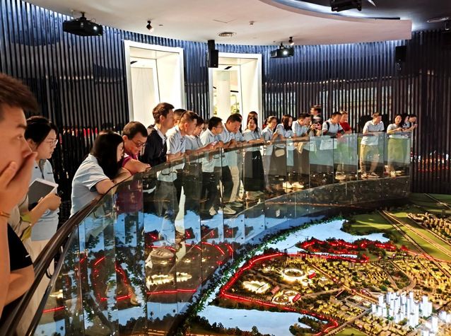 走出展厅,大家一起来到“马蹄莲”一侧的副楼——武汉光谷未来科技城展厅。据工作人员介绍,未来科技城全域处于武汉新城规划范围内,当前正在全力推进武汉新城核心区建设,已聚集一批世界500强、央企、上市公司等龙头企业,以及国家实验室、大科学装置、国家重点实验室、国家级创新中心、算力中心等创新平台,形成了核心技术体系和产业优势,为光谷科创大走廊“一路向东”奠定了空间基础,也为扛起“光谷大脑”大旗提供了坚实的人才支撑。