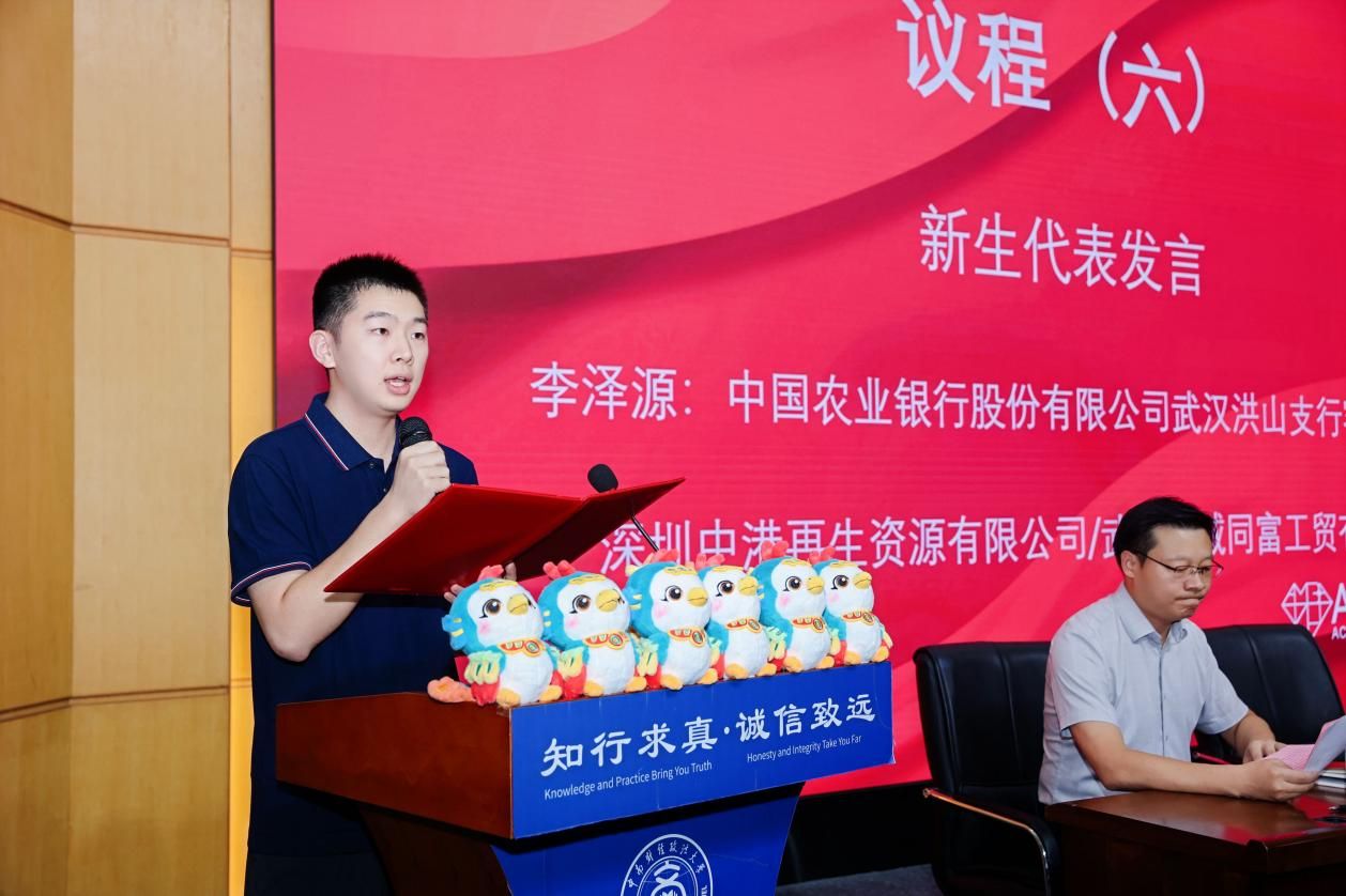 新生代表发言环节,2025级MBA新生代表、中国农业银行股份有限公司武汉洪山支行客户经理李泽源同学身为“财二代”讲述了从父母口中听中南大的故事,直到如今圆梦走进中南大校园的浓厚感情。并期待作为新生,愿能在这段宝贵的时光里,快乐学习、敏于求知,最终遇见更好的自己!