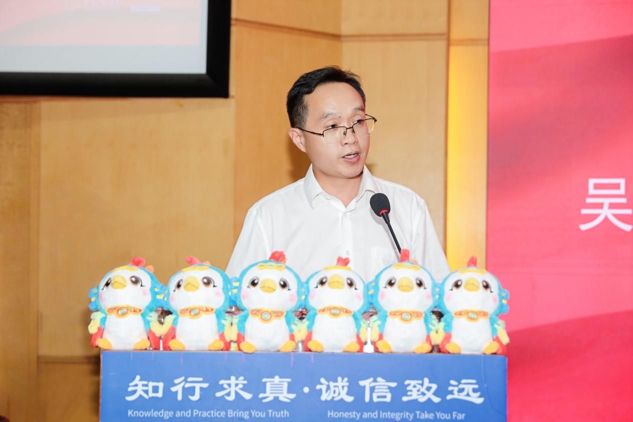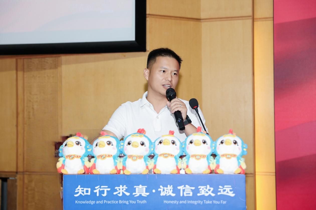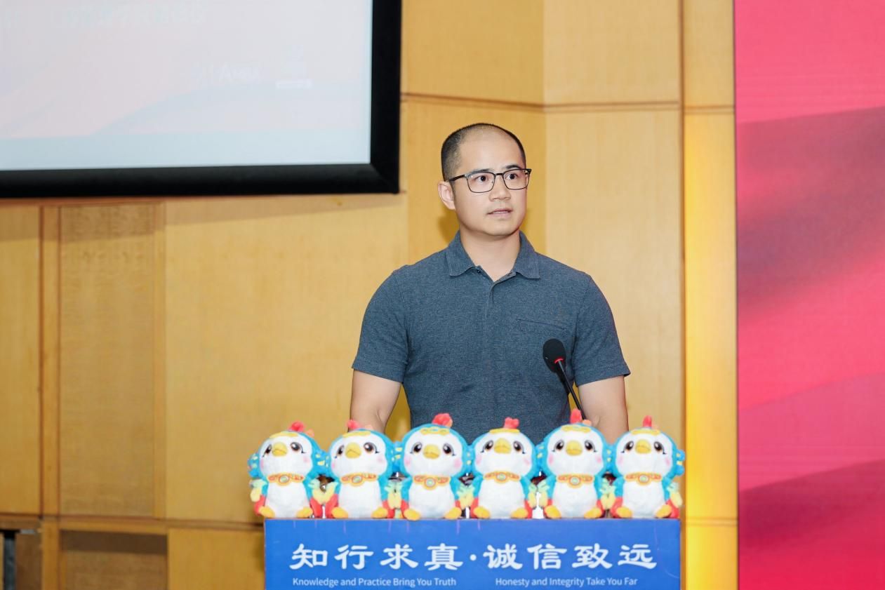 教师代表发言环节,工商管理学院运营与供应链管理系徐浩轩副教授,首先对每一位新同学的到来表示热烈的欢迎,并与新生们分享了四点感受:重铸空杯心态、拥抱系统学习,激发跨界思维、追求融会贯通,坚持知行合一、勇于实践探索,珍惜同窗情谊,共建学习共同体。最后对新生们予以了祝福与期待。
