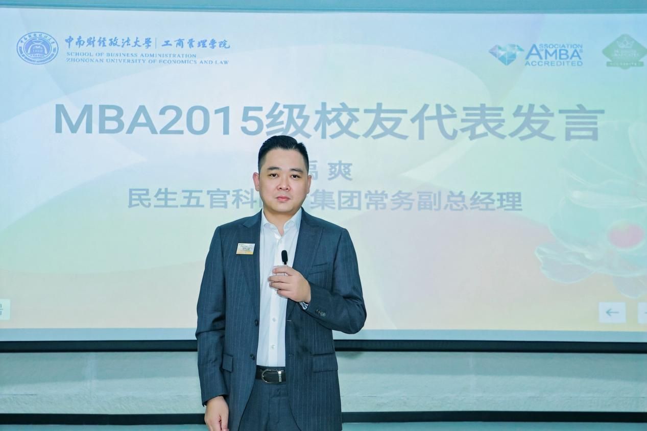 2015级MBA校友代表、民生五官科医疗集团常务副总经理禹爽回忆了在MBA的学习时间里,不仅是知识的积累,更是思维方式的重塑、视野格局的拓展。并强调在中南大MBA学习过程中搭建的思维框架成为职场中重要的“内驱力”和行动“罗盘”。