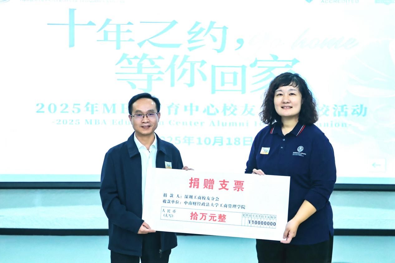 随后,会议现场播放来自深圳工商校友分会的视频祝福,并为学院捐赠十万元人民币。
