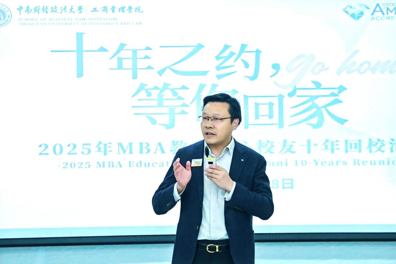 2015级MBA校友、北京兰台律师事务所高级合伙人吕强以“在不确定的人生中寻找坐标:我的转型之路”为主题,分享了自身转型探索的历程。强调了MBA的学习使得自身从“专业服务提供者”到“组织引领者”的转变,在多种角色的平衡中升华。最后祝愿大家在中南大“博文明理、厚德济世”的校训滋养下,都能获得直面变革的勇气和智慧!