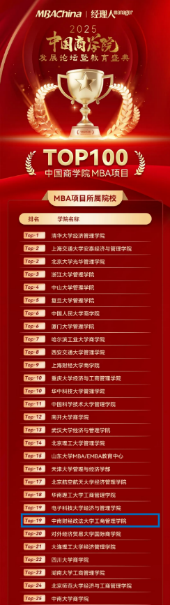 在本次公布的榜单中,米兰电竞·(中国区)工商管理学院荣获“2025年度中国商学院MBA项目TOP100”第19名,工商管理学院MBA项目荣获“2025年度中国商学院金融MBA项目TOP10”第6名。
