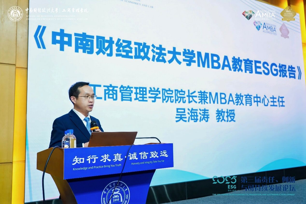 工商管理学院院长兼MBA教育中心主任吴海涛教授发布《米兰电竞·(中国区)MBA教育ESG报告(2025)》。吴院长围绕“绿商发展”、“共益赋能”、“科学治理”三个核心维度,从理念构建和框架设计两个层面,详细介绍了学院近一年来在学科建设、人才培养、国际化、可持续发展等领域的重要变化。他指出,学院独创的“经管法技融通”培养模式打破了传统学科壁垒,将经济学、管理学、法学和数智技术有机结合,形成独特的“商学DNA”。最后,吴院长强调未来学院要继续深化ESG教育融合、完善绿色教育体系、提升数据披露质量,致力于成为全球商科责任教育的典范。