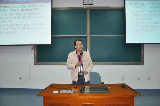 覃创建老师是广西财经学院资产评估教研室主任,“财政支农资金绩效评估”报告是覃创建老师承担的中国资产评估协会2010年度招标课题《财政资金绩效评估研究》(课题编号[3201022004])、2011年度广西财政系统重点调研课题《广西财政支农资金绩效评估研究——以广西农垦系统为例》和百色市右江区2010年革命老区专项转移支付项目绩效评价项目(2011年百色市右江区财政局委托项目)三个课题的部分研究成果。覃创建老师引领大家回顾了我国财政支农资金绩效评估历史,并对其现状进行了梳理。随后,覃创建老师介绍了财政资金绩效评估推进进程、财政支出绩效评估制度以及财政支农资金总体绩效评估。