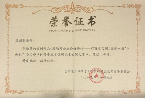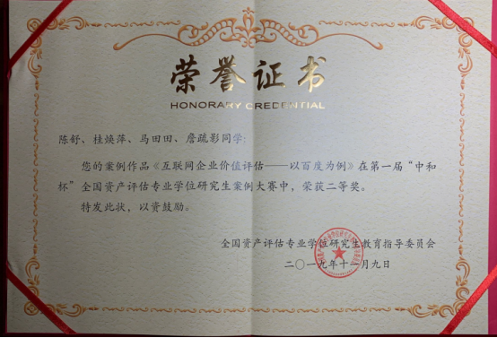 11月8号,首届“中和杯”全国资产评估专业学位研究生案例大赛复赛在中国地质大学(武汉)隆重举行,本次比赛以“互联网企业价值评估”为主题,各参赛队伍在百度、阿里巴巴、腾讯、京东、小米、Facebook、Twitter、Google、Apple和Amazon等十家著名互联网企业中选择研究对象企业,依据企业披露的财务信息和非财务信息以及媒体对企业相关事件的公开报道,运用相关资产评估理论,围绕对企业市场表现和企业价值的影响进行分析和研究,包括互联网企业引进投资、上市和再融资、并购重组,以及突发因素和公共事件等对企业价值及其评估产生的影响等。此次比赛共有全国20支队伍参加,通过匿名评审,最终6所高校队伍进入复赛。在我院资产评估导师组组长王娟娟副教授的指导下, 2019级资产评估专业学生陈舒、桂焕萍、马田田、詹疏影四名学子以《百度公司企业价值评估》为题,通过案例陈述和答辩两个环节比拼,最终荣获二等奖。复旦大学获得一等奖,武汉理工大学获得二等奖,上海财经大学、重庆理工大学、山东财经大学获得三等奖。