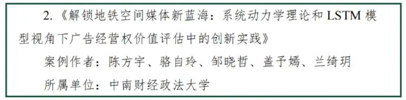 2024年11月9日,中国学位与研究生教育学会资产评估专业学位工作委员会公布了“中和杯”第十二届资产评估教学案例大赛获奖成果名单。工商管理学院、企业价值研究中心陈方宇副教授团队(陈方宇、骆自玲、邹晓哲、盖予嫣、兰绮玥)申报的案例《解锁地铁空间媒体新蓝海:系统动力学理论和LSTM模型视角下广告经营权价值评估中的创新实践》荣获三等奖。