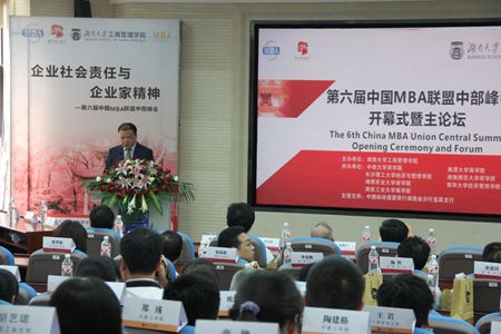 On June 16th, 2012, opening ceremony of the “6th China MBA Summit of Central China” and the main forum were grandly held at Business School of Hunan University. China National MBA Education Supervisory Committee sent congratulation messages. Professor Pinsheng Deng (standing committee member of Hunan University’s CPC Committee, Vice Secretary, and Secretary of Committee for Discipline Inspection) and Pu Wang (Honorary Chairman of China MBA Association) delivered important speeches. Zeliang Liu (Party Secretary of Business School, Hunan University) made a welcome address. Xinting Zhang (Chairman of China MBA Association) granted the Association Flag to Hunan University. Representatives sent by ZUEL MBA School included Yanming Wang (teacher of MBA School), Jie Huang (Chairman of MBA Students’ Union), Mingxiang Zhou (Vice Chairman of MBA Students’ Union), Na Xiao (Vice Chairman of MBA Students’ Union) and Jun Fu (Chairman of Management Consultancies Association).