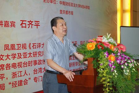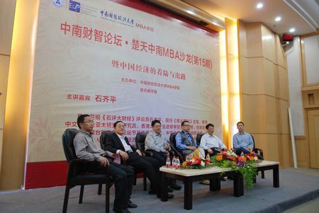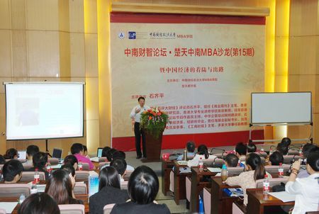 On October 12th, the 15th Chutian-Zhongnan MBA Salon---“Zhongnan Intelligence Summit Forum of 2012 and the Landing and Future of China’s Economy”---was held at Shouyi Campus of ZUEL. Mr. Qiping Shi (economic commentator of Phoenix TV), Professor Haisu Wang (Dean of MBA School), Professor Qing Ye (Deputy Director of Hubei Statistical Bureau), Mr. Jianhua Chen (Chairman of Wuhan Trade State-owned Holding Group Co., Ltd.), Mr. Fan Xie (Chairman of Wuhan Hilans Automation Machine Co., Ltd.) were present at the Forum.