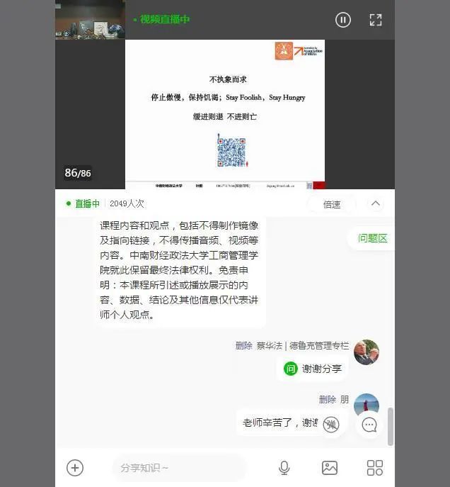Since the beginning (7 pm) of the lecture, it has attracted the attention and support of a large number of students and alumni. The number of people who listened to the lecture online once reached as high as 2049! The students actively communicated with DU through the online form, and DU patiently answered the questions one by one.