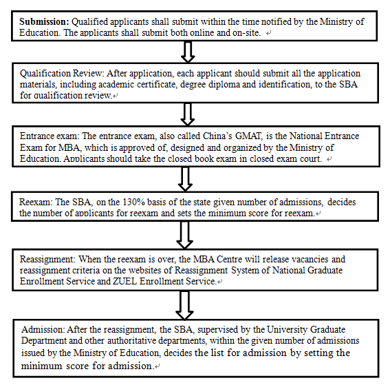 The SBA is entitled to enroll independently in the framework authorized by the University. The enrollment scale, entrance examination and admission criteria of the MBA programme are scheduled by the Graduate Enrollment Committee of ZUEL and the specific implementation measures are set and carried out by the School