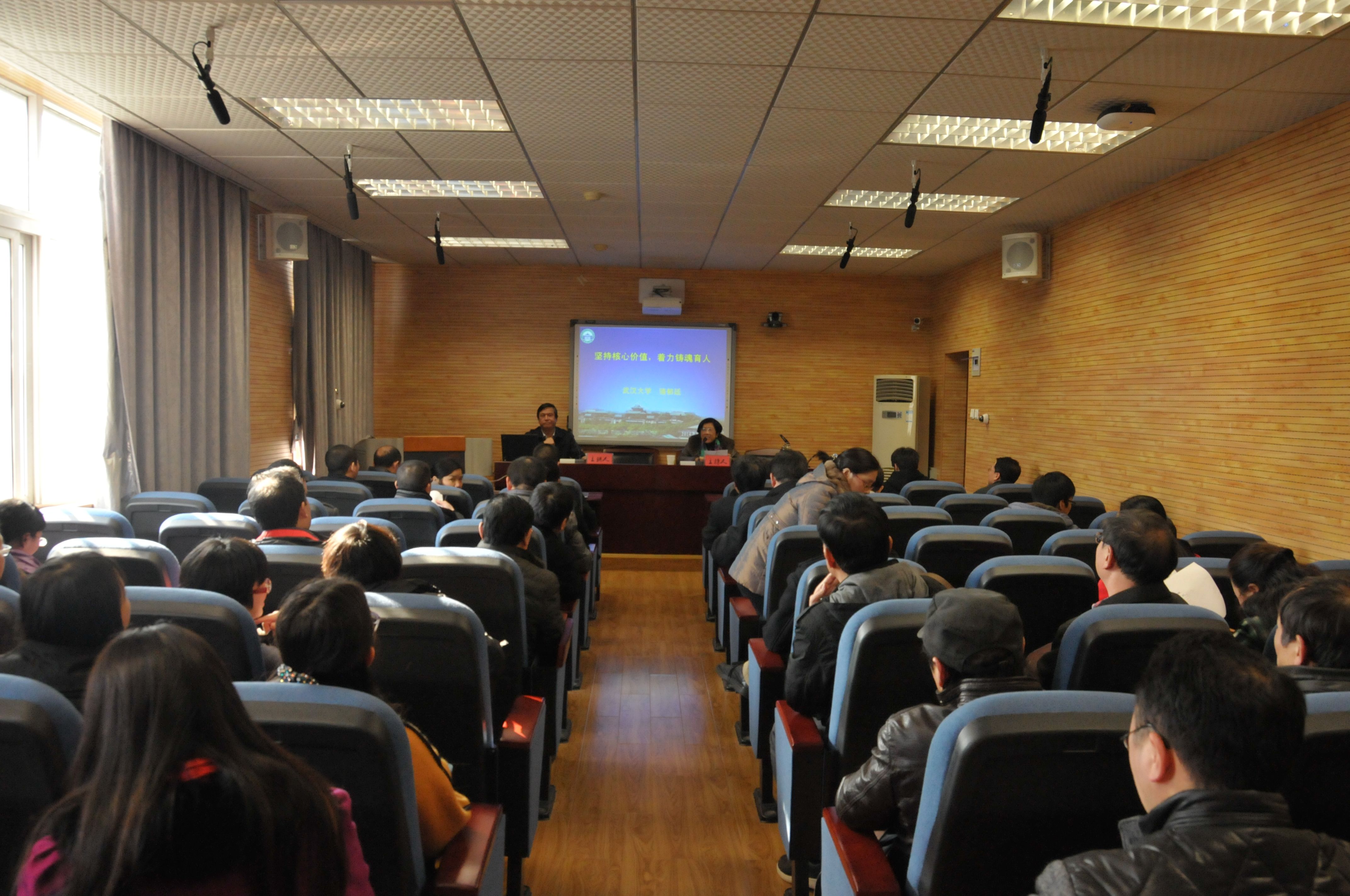 (通讯员 高梦娇)2014年12月4日下午,武汉大学党委副书记、博士生导师骆郁廷教授应邀在文沛楼409会议室开展了题为《坚持核心价值 着力铸魂育人》的专题讲座。本次讲座由马克思主义学院王建辉教授主持,马克思主义学院党委中心组全体成员以及全体教职工一起进行了两个小时的认真学习。