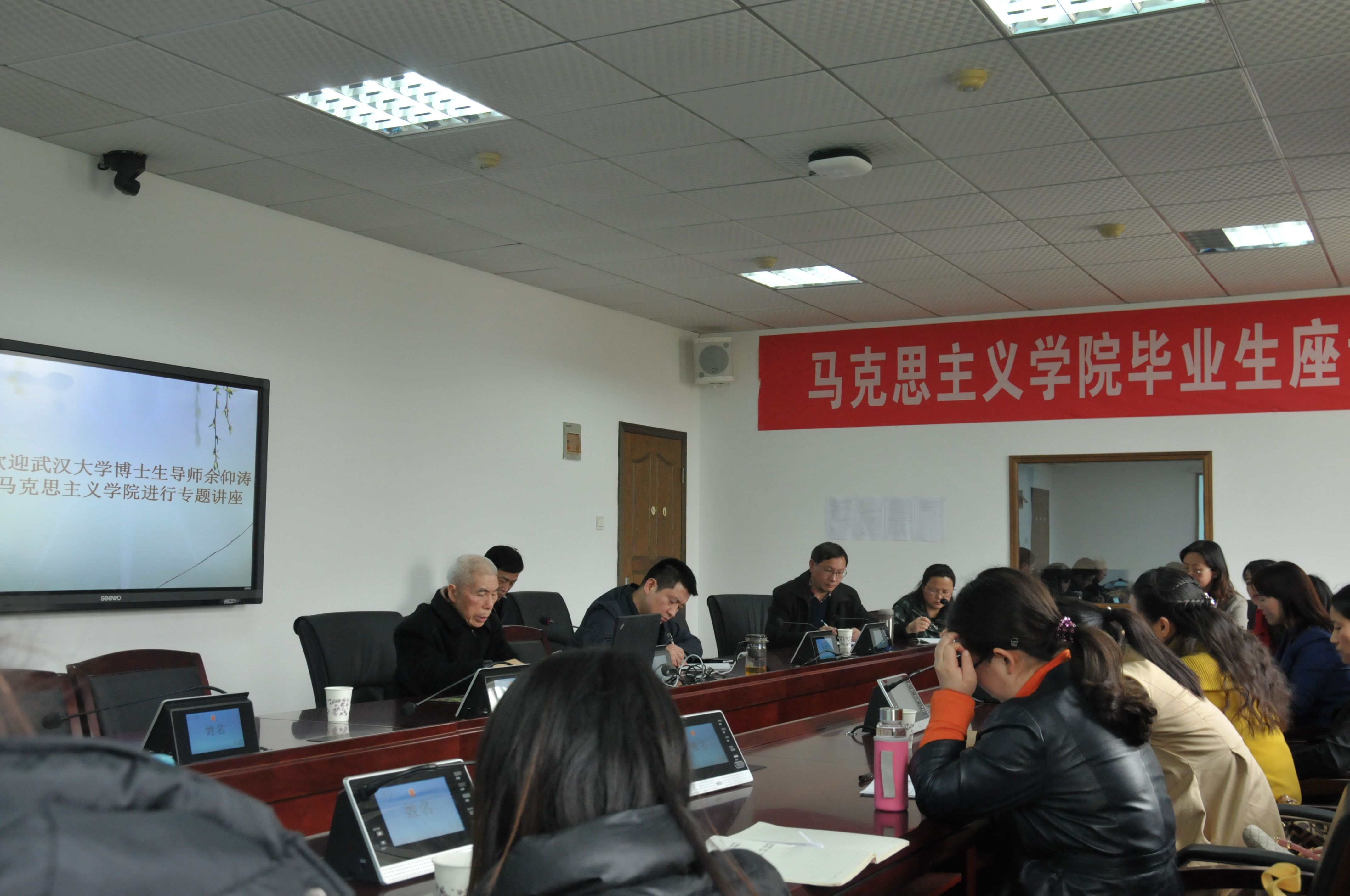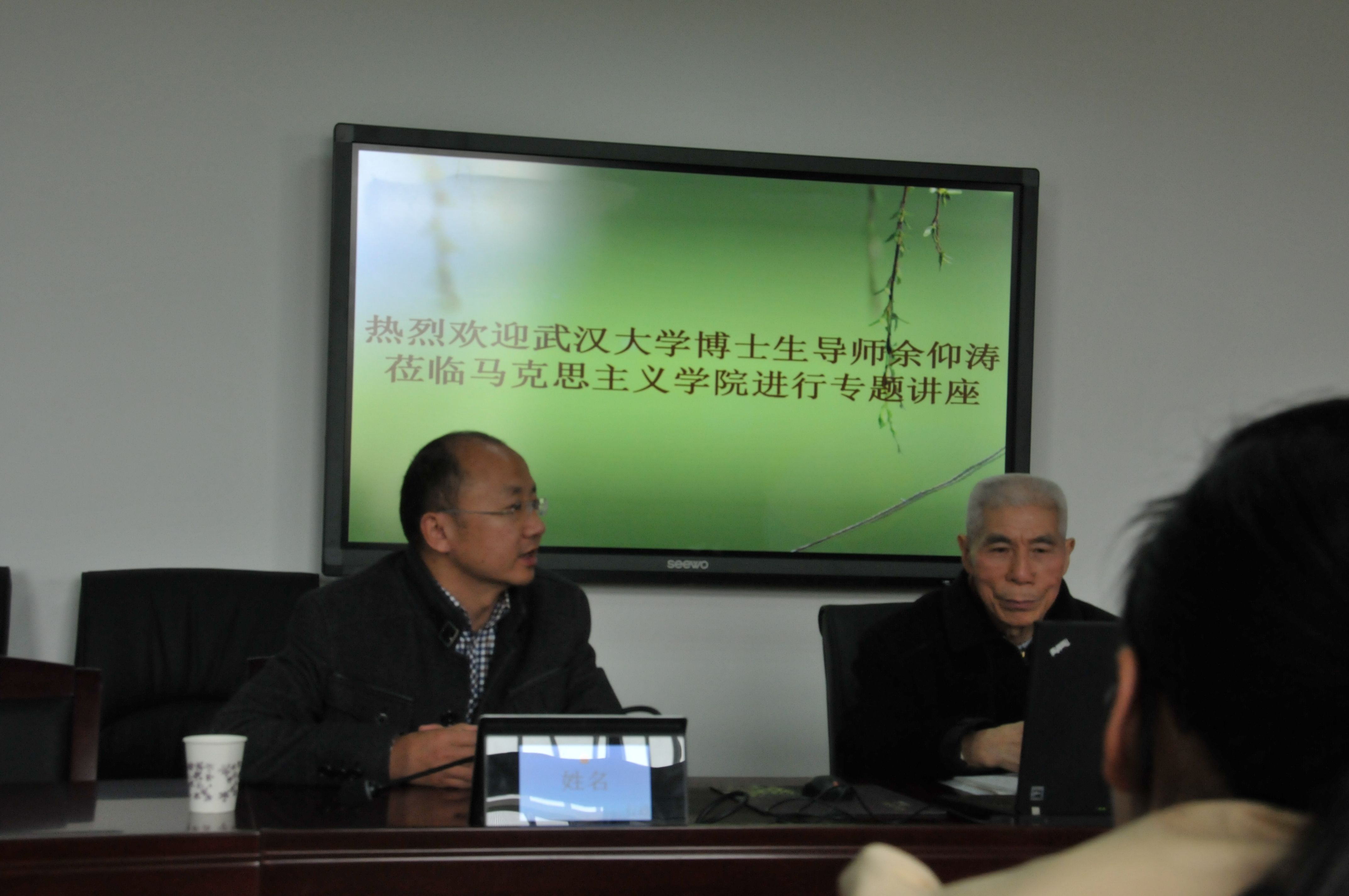 (通讯员 李朝阳)4月10日下午,武汉大学教授、博士生导师、国务院政府特殊津贴专家余仰涛教授应我院邀请前来讲学。讲座由龚先庆院长主持,李世黎副院长及思想道德修养教研室全体教师和研究生听取了讲座。