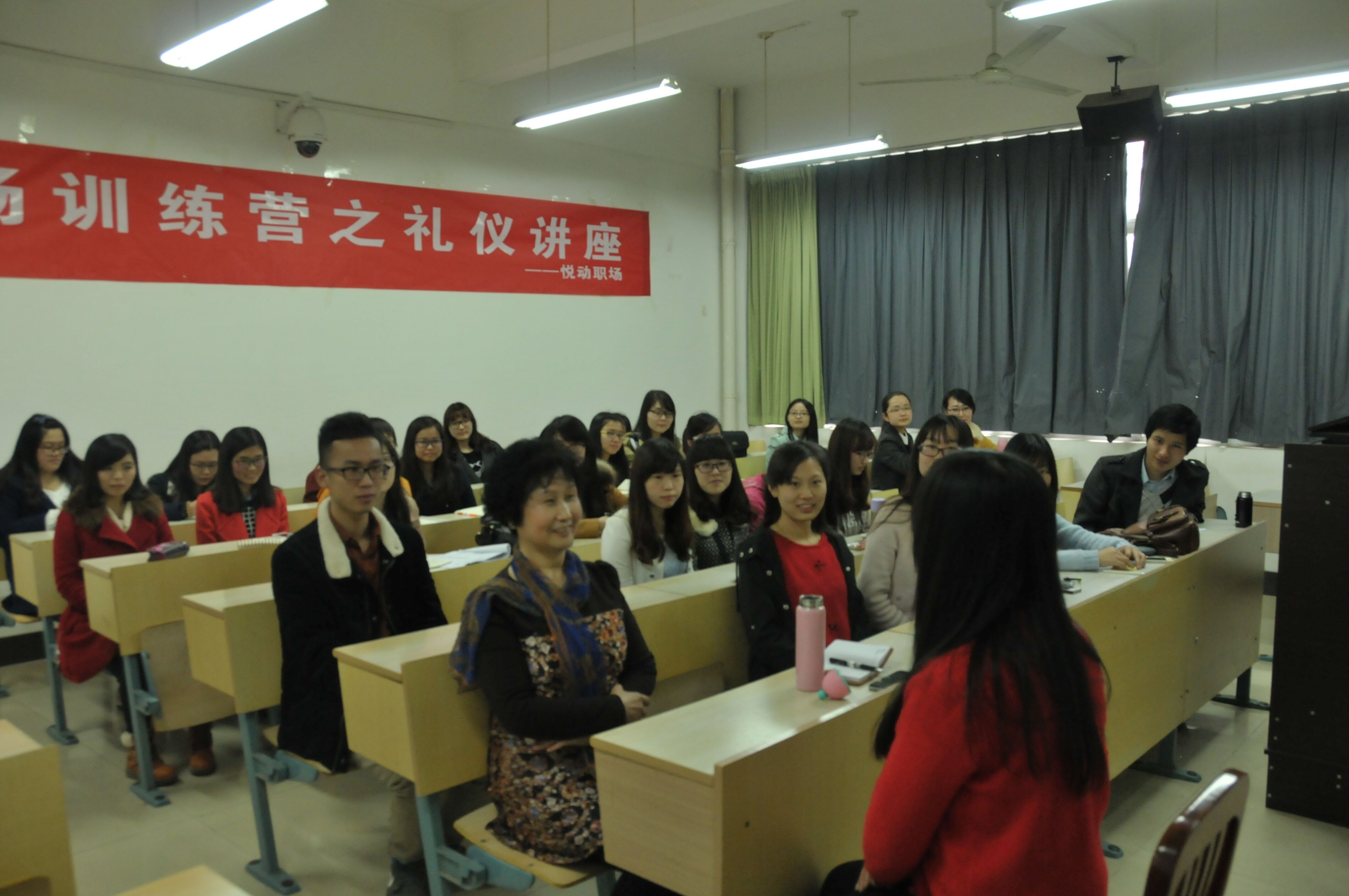 在讲座过程中,胡女士与同学们积极互动,解答了同学们有关礼仪方面的困惑,并亲身示范了在面试过程中的动作、服饰礼仪甚至是表情,让同学们获益匪浅。